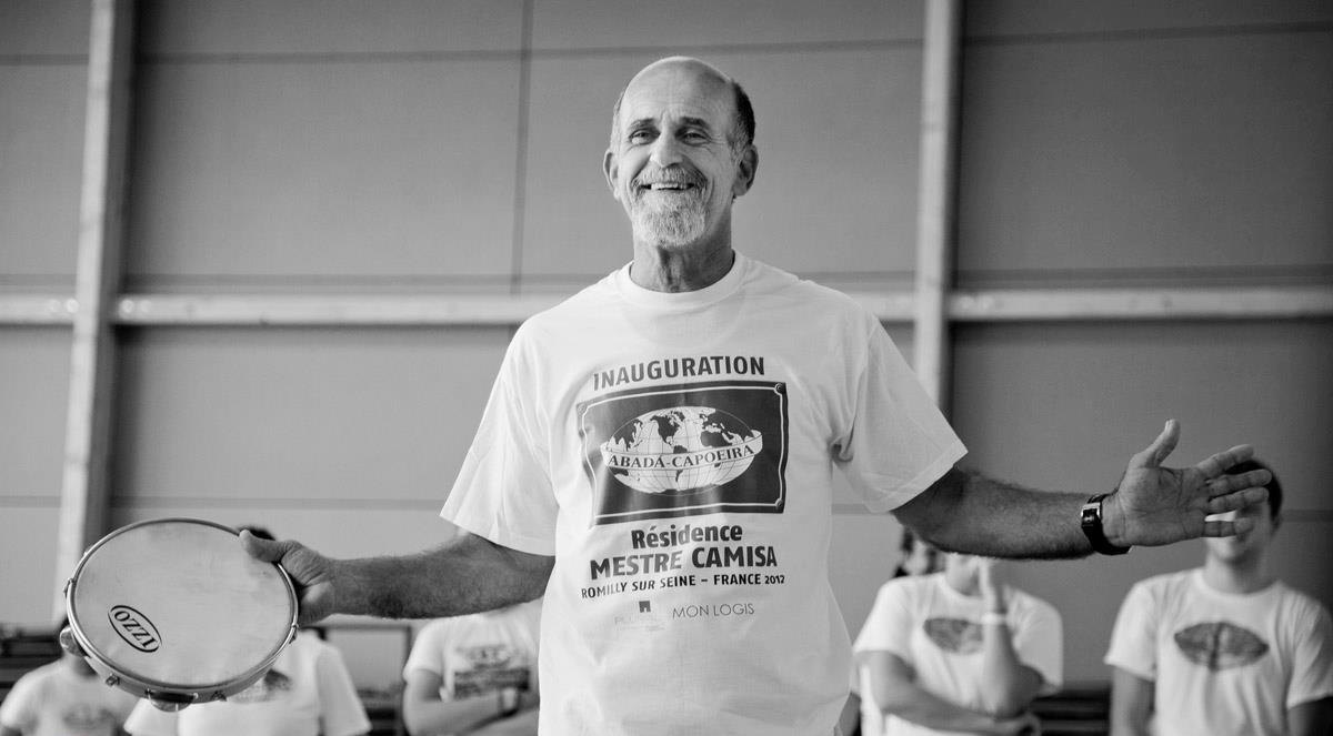 メストレ・カミーザ(Mestre Camisa)は、本名をJose Tadeu Carneiro Cardosoといい、1955年バイーアに生まれました。メストレ・ビンバの生徒だった兄のグラオン・メストレ・カミーザ・ホーシャ(Grão Mestre Camisa Roxa:本名Edvaldo Carneiro e Silva, 1944~2013)と共に、1988年にリオデジャネイロを本拠地にアバダ・カポエイラを設立しました。